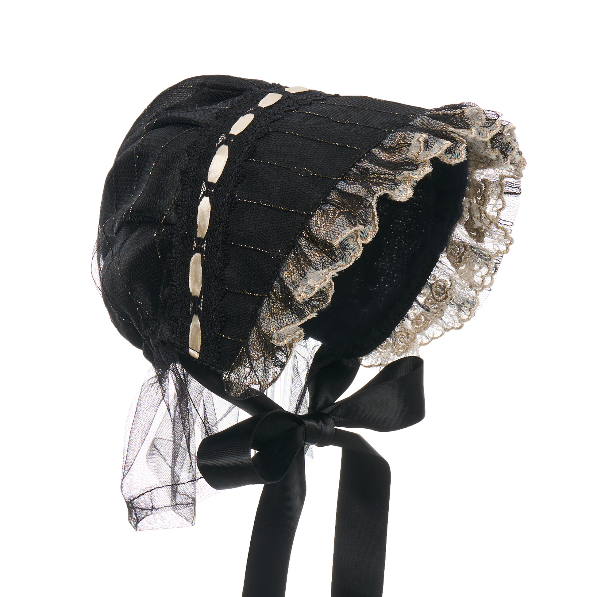 Its striking black-and-white palette adds a touch of vintage drama, while the lace-trimmed edges and satin bow bring elegance to every angle. Unlike mass-produced accessories, each bonnet carries its own character — subtle variations created through hand-finishing techniques make every piece one of a kind.