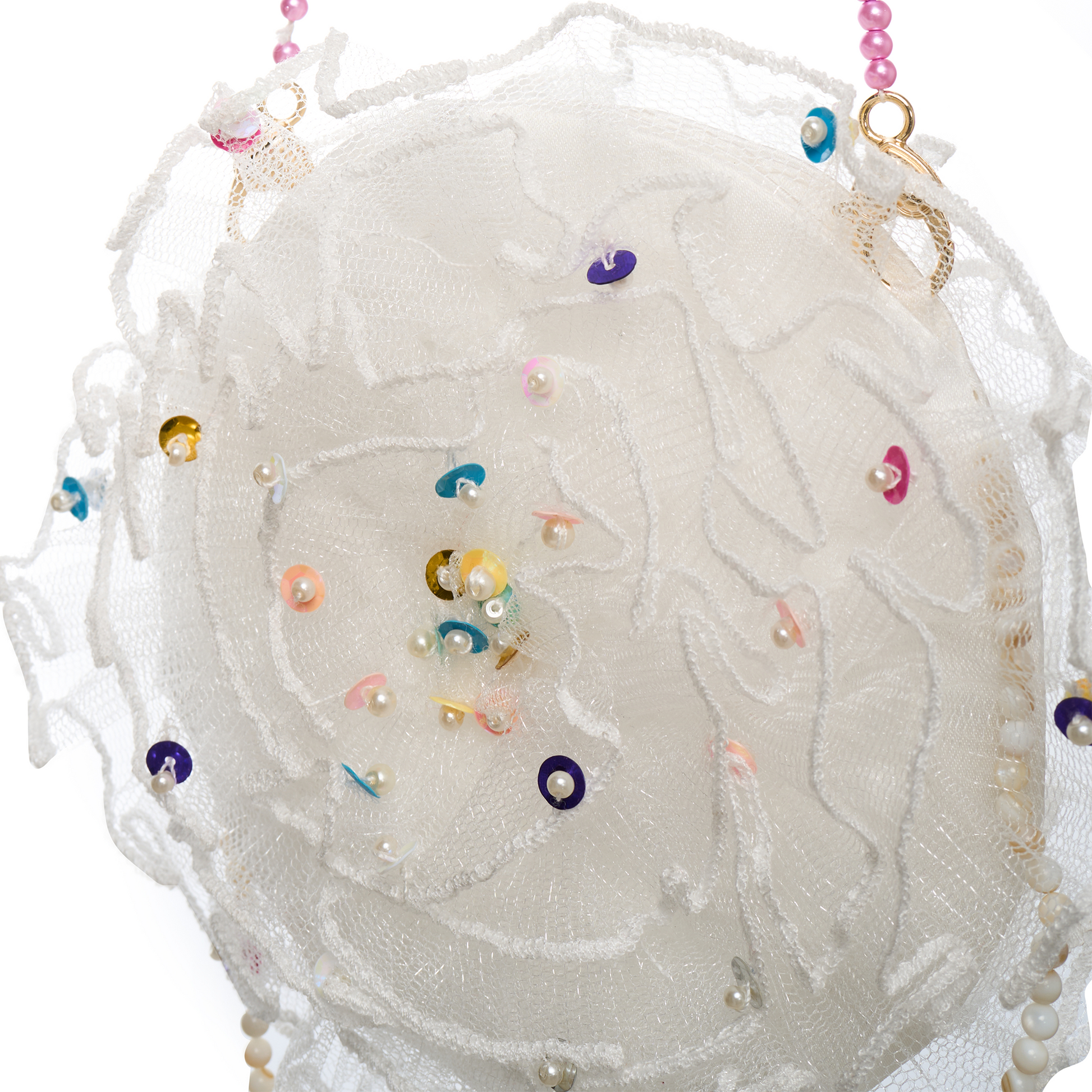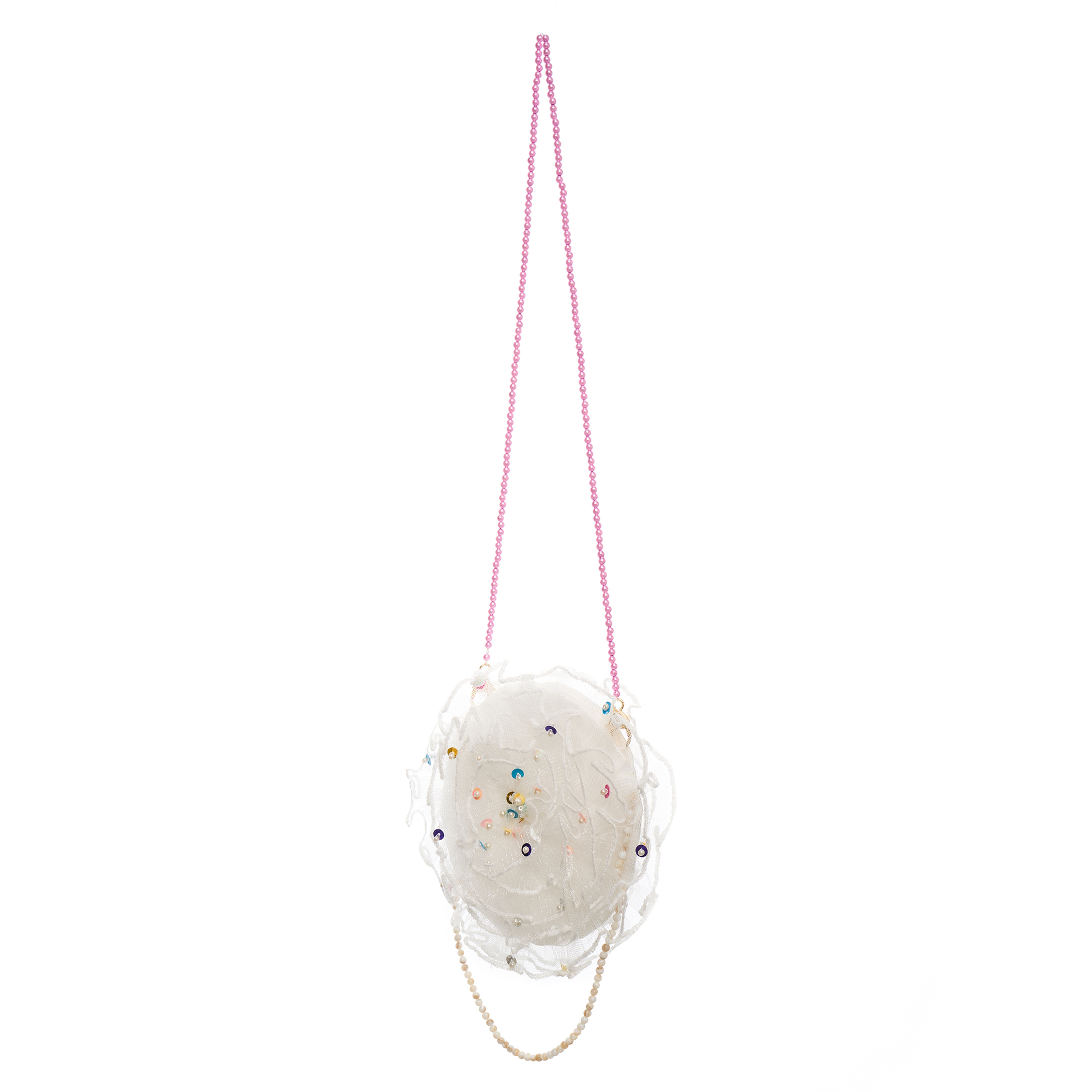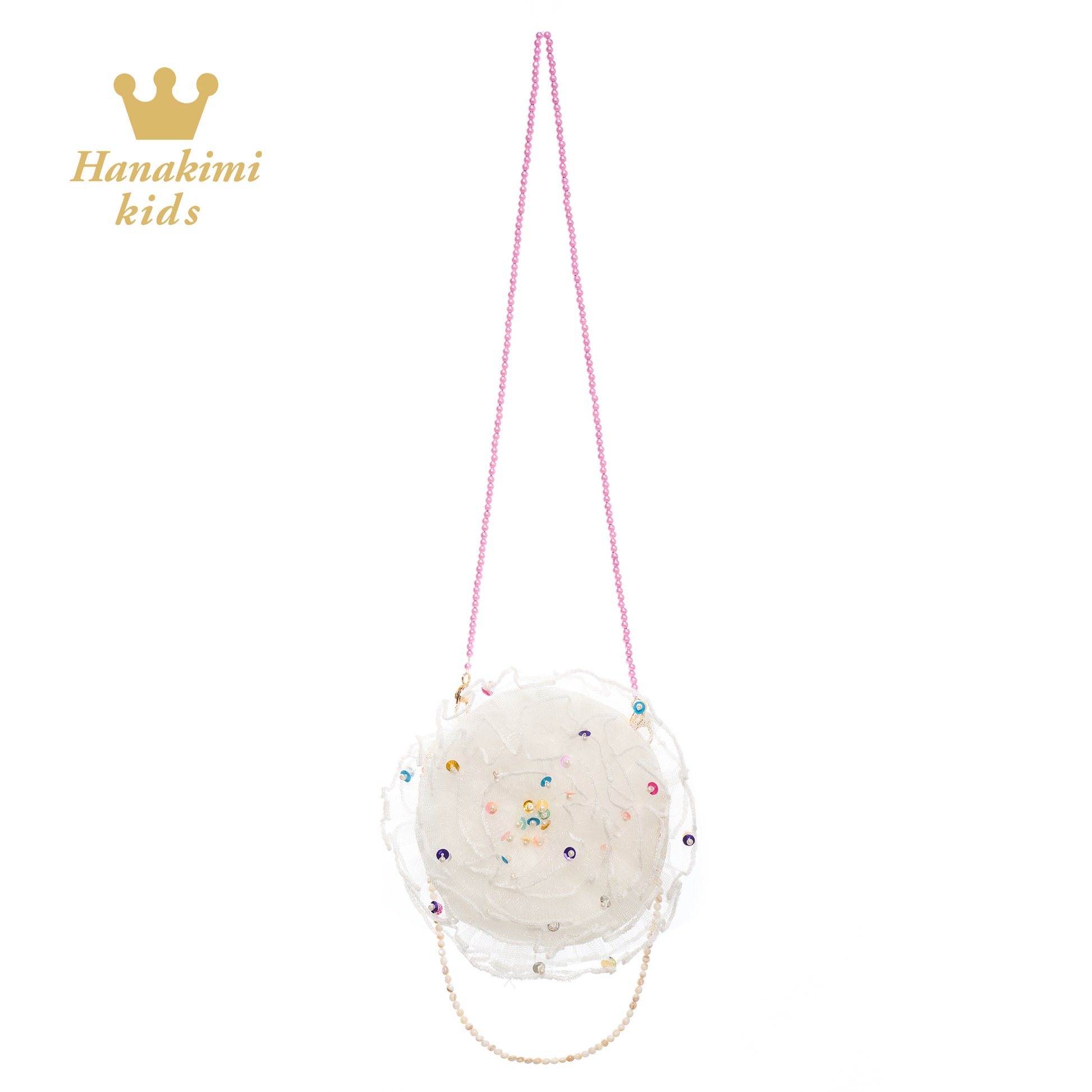 This petite petal-shaped crossbody bag, soft as a cotton candy, is adorned with rainbow sequins that twinkle like a galaxy stitched onto its surface.