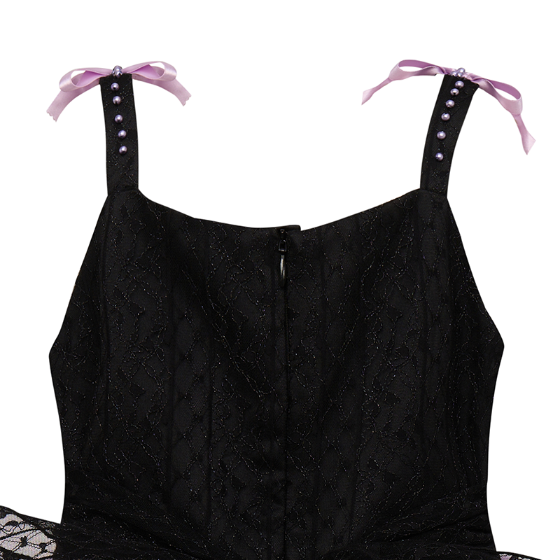 Crafted by Hanakimi's European design team, this party dress is exclusively designed for little girls. The clever interplay of black and pinkish-purple, combined with exquisite black lace, creates a sophisticated look. Hand-sewn pearls and bows dance like lively notes upon the shoulders.