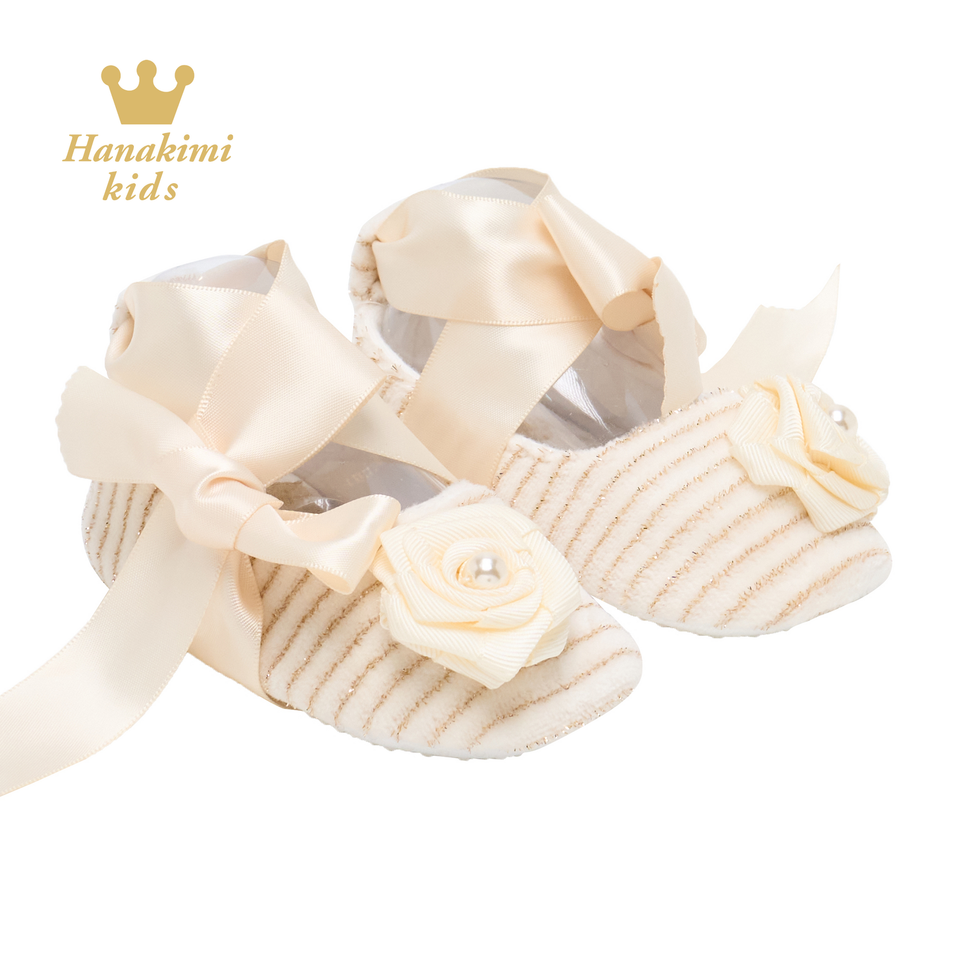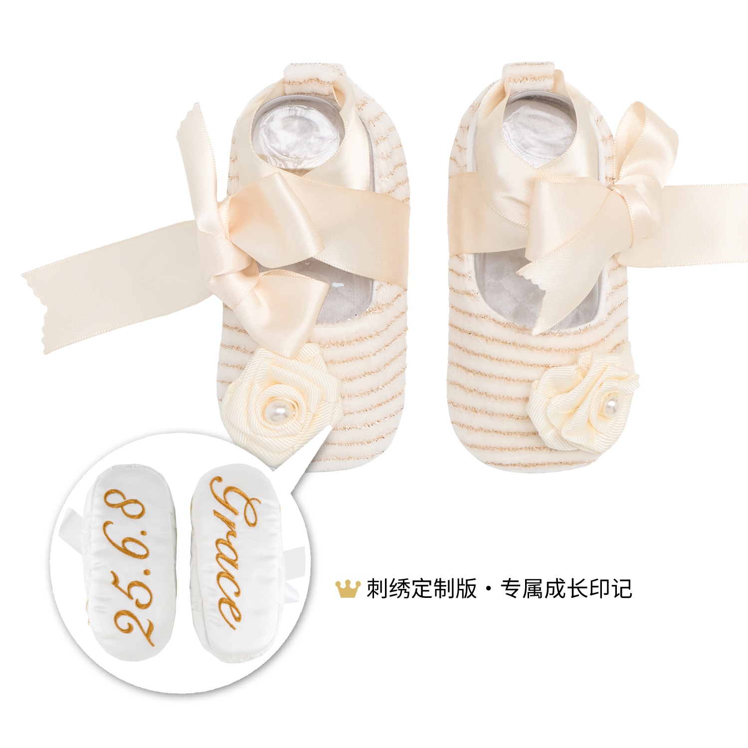 A champagne-hued silk ribbon ties gently around the ankle, securing the shoes while adding a touch of playful charm to tiny feet. The removable silk-lined insole offers breathable comfort, catering to the delicate needs of infant skin.