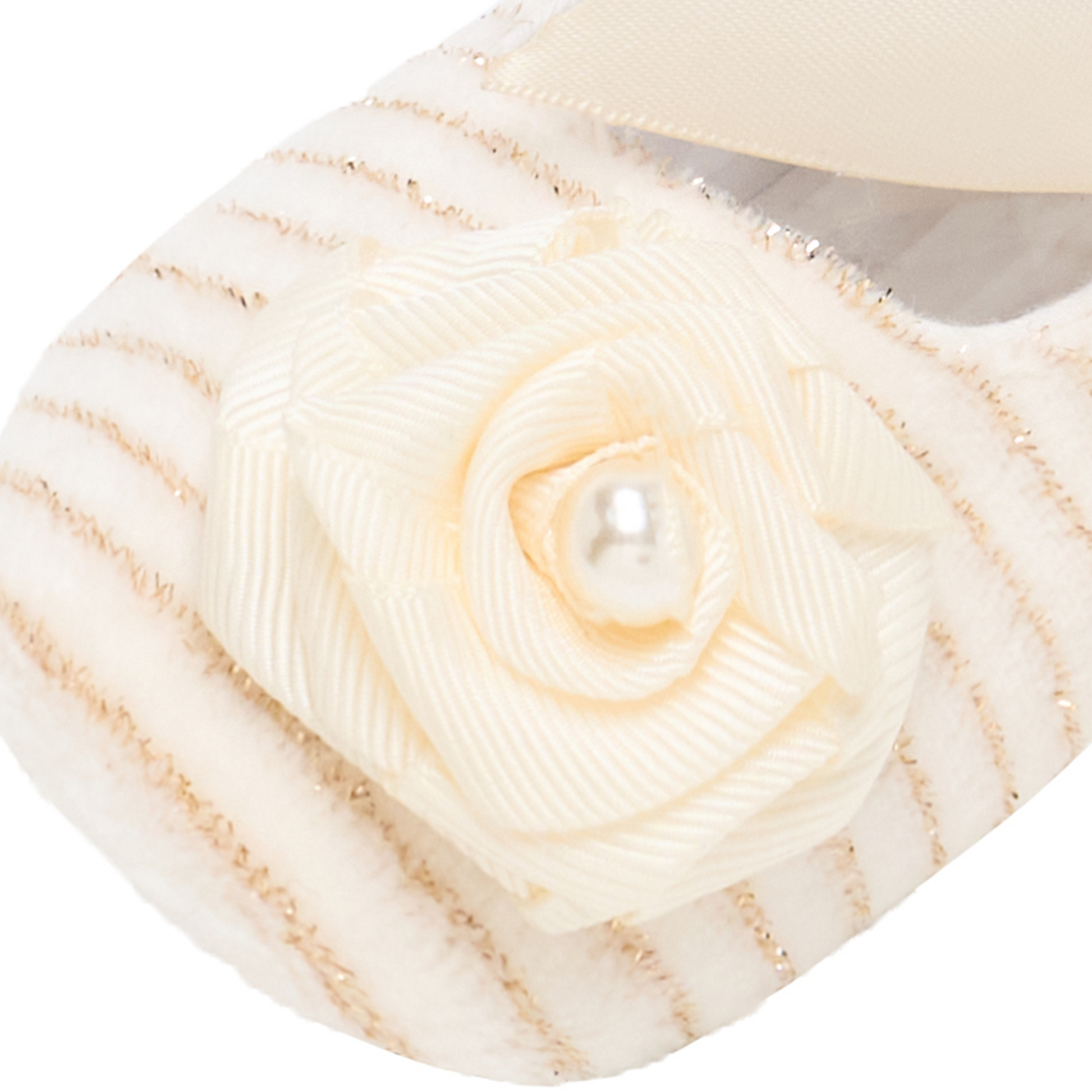 Golden-threaded velvet with delicate stripes exudes sophistication, where shimmering filaments are woven into the plush surface like scattered starlight. The hand-stitched floral motif at the toe blooms in three-dimensional elegance, as if freshly plucked from a storybook garden, with a pearl at its center glistening like morning dew—soft and enchanting.